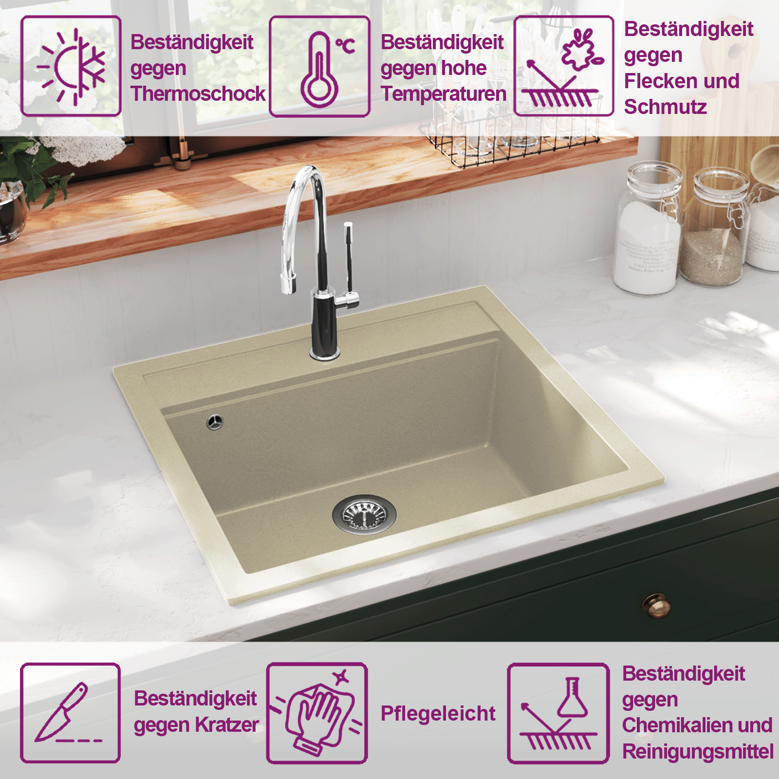 Dank qualitativ hochwertigem Granit ist das Spülbecken nicht nur schlagfest, hitze- und kratzbeständig, sondern lässt sich auch ganz einfach reinigen. Im Lieferumfang ist auch ein Siebkörbchen enthalten, um gröberen Schmutz beim Abwaschen aufzufangen.