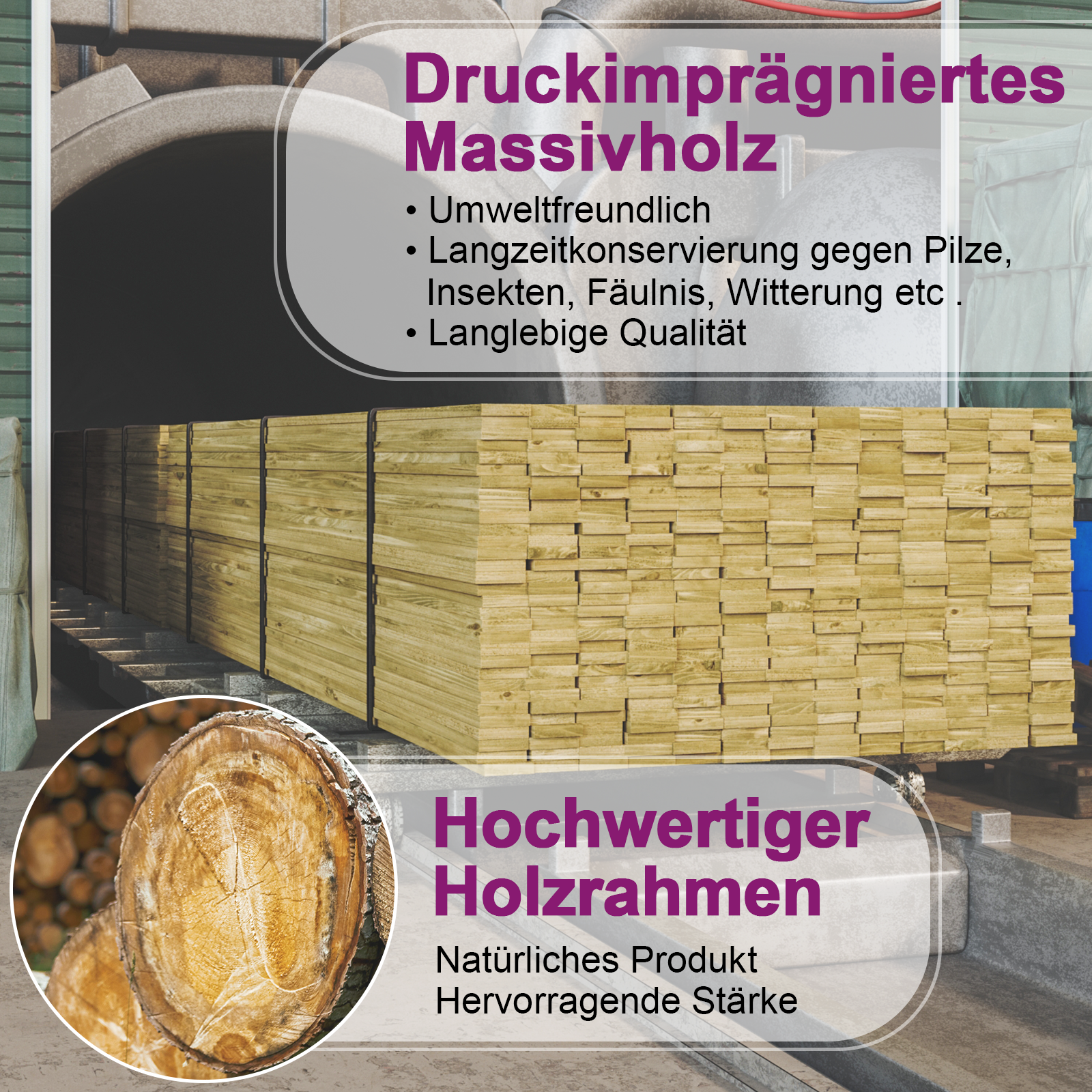 Dieses robuste und verrottungsbeständige Hochbeet ist aus massivem, grün imprägniertem Kiefernholz gefertigt. Der Zusammenbau ist sehr einfach.