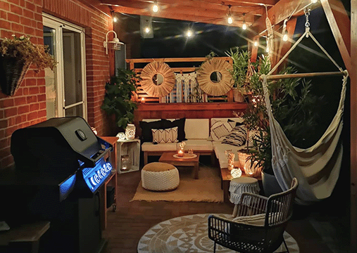1. Beleuchte es mit Lichterketten, Laternen und flammenlosen Kerzen für eine gemütliche Stimmung.